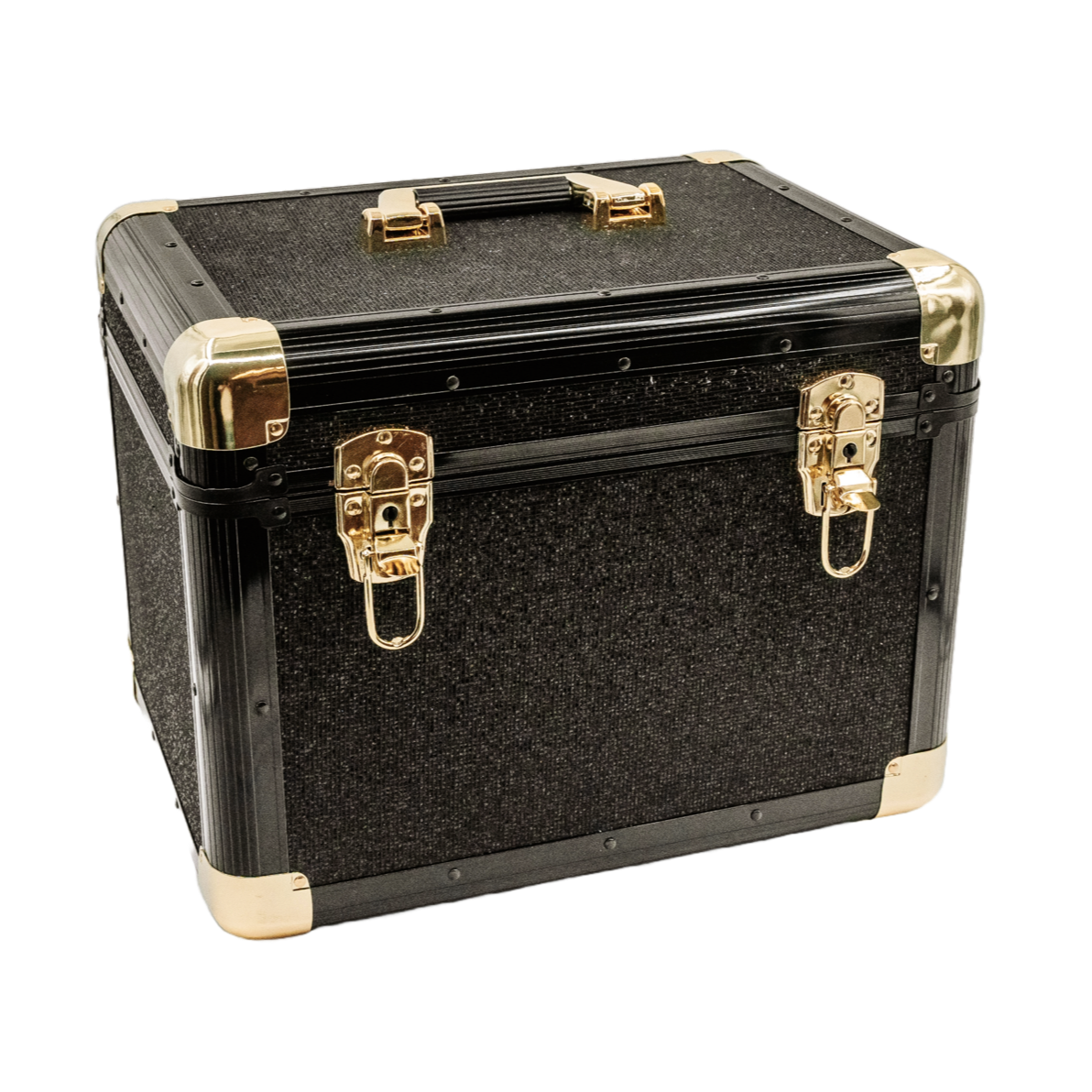 Die Pferdegold® Putzbox von Pferdegold ist eine schwarz-goldene Aufbewahrungsbox mit Metallverschlüssen, verstärkten Ecken und einem Griff an der Oberseite.