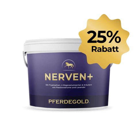 Pferdegold Nerven 2.0 ist ein Ergänzungsfutter mit wichtigen Mineralien und Vitaminen. Bei besonderen Verhaltensauffälligkeiten solltest du aber auf jeden Fall mit deiner Tierärztin oder deinem Tierarzt sprechen, ob eine Ergänzung sinnvoll ist.